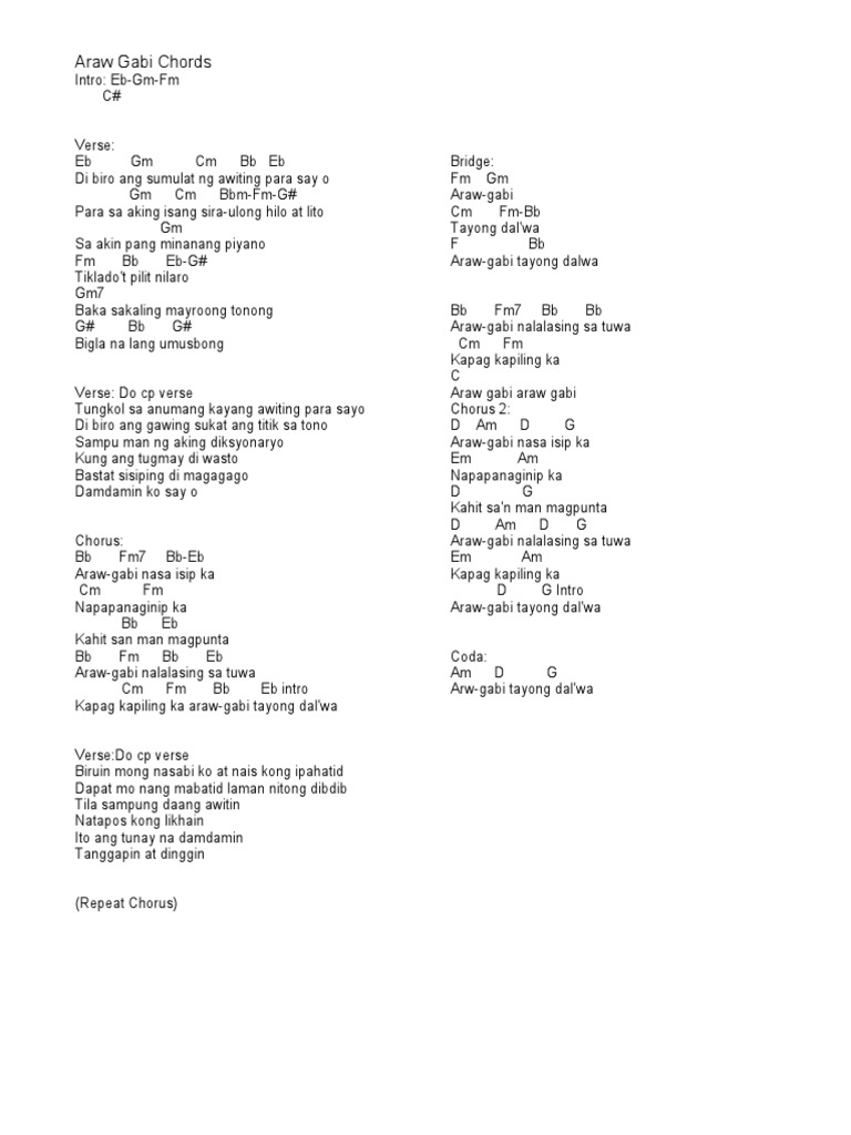 Eb Ab Gm G Cm Db Fm Bbm Bb F Abm Em Ebm Am C Dbm Bm D Chords for ARAW GABI REGINE VELASQUEZ with song key BPM capo transposer play along with guitar piano ukulele. Biruin mong nasabi ko at nais kong ipahatid. Araw Gabi chords by Regine Velasquez with chords drawings easy version 12 key variations and much more.